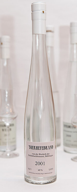 Nach langem Suchen und vielen Telefonaten mit verschiedenen Brauereien war die Schönbuchbrauerei in Böblingen bereit, uns untergärige Bierhefe aus ihrer Produktion zu überlassen. Bierhefe schäumt beim Destillieren trotz Rühren und vorsichtigem Anheizen so sehr, dass Teile der Maische bis in die Destillationsvorlage mitgerissen werden. Dies bedeutet, dass das Destillat danach nochmals gebrannt werden muss. Bierhefebrand hat einen sehr charakteristischen Geschmack und ist nicht bei jedem beliebt. So wurde bei der Prämierung von 2 Prüfern über 18 Punkte (Gold) vergeben, ein Prüfer blieb aber bei 16 Punkten (Silber).