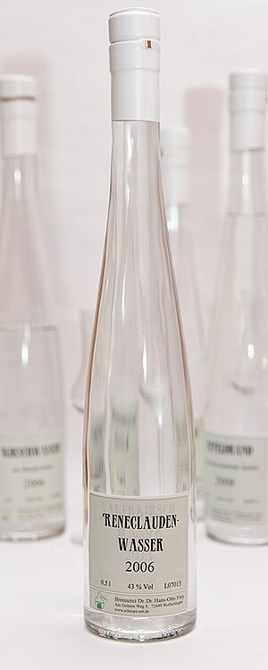 Die Reineclaude wurde in Frankreich auf einem Gut in Ciligny um 1800 zufällig als Sämling entdeckt. Später wurde sie in einer Baumschule in Oullins (bei Lyon) als Reineclaude d´Oullins kultiviert. Der Name geht auf die französische Königin Reine Claude (um 1500), Mutter von König Henry II zurück. Die Früchte sind groß mit grüngelber Haut und grünlichweißem aromatischem Fruchtfleisch. Der Geschmack des Destillats kann seine Verwandtschaft zu Zwetschgen- und Mirabellenbränden nicht verleugnen.