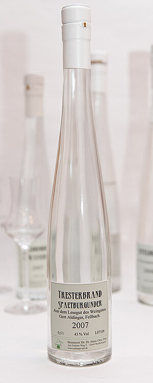 Er stammt, wenn man den Genetikern glauben darf aus dem Niltal und soll sich aus der Wildrebe "Vitis vinifera occidentalis" entwickelt haben. Sein Weg nach Europa ist mit der Verbreitung der Rebkultur durch Phönizier, Griechen und Römer verbunden. Im Burgund kann er bis in das 4. Jahrhunder n. Chr. zurückverfolgt werden. Das Brennen von Rotweintrestern unterscheidet sich von Weißweintrestern dadurch, dass der Rotwein auf der Traubenmaische vergärt und somit nach dem Abpressen der Maische die Gärung weitgehend beendet ist. Dies bedeutet, dass Rotweintrester umgehend gebrannt werden sollten. Der Trester für unseren Tresterbrand aus Spätburgunder stammt aus dem Weingut Gert Aldinger in Fellbach.