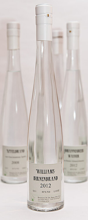 Verbreitet wurde die Sorte ab 1814 unter dem Namen »Williams Bon Chrétien« vom Baumschulenbesitzer Richard Williams aus Middleessex. Der Williamsbirnenbrand gehört zu den beliebtesten Obstdestillaten. Dies ist auch der Grund, warum oft versucht wird dem Aroma etwas nachzuhelfen. Das kann durch Zusatz von Zucker oder Birnensaft zum Destillat geschehen, aber auch durch Aromatisieren mit künstlichem Williams Aroma, was leider auch von renomierten Brennereien gelegentlich schon praktiziert wurde. Das Geheimnis eines guten Williamsdestillats sind reif geerntete Williamsbirnen, die zur gleichmäßigen Reife einige Tage nach der Ernte nachreifen. Die Birnen werden dann gekühlt eingemaischt und bei möglichst niederen Temperaturen unter Säureschutz mit Reinzuchthefe vergoren. Das Aroma kann jahrgangsweise etwas variieren. Wir beziehen unsere Birnen aus dem Vintschgau, wo wir über Jahre gleichbleibende gute Qualität bekommen oder aber in neuester Zeit aus der Gegend um Stuttgart, wo wir die Früchte vollreif in mehreren Durchgängen vom Baum pflücken können.